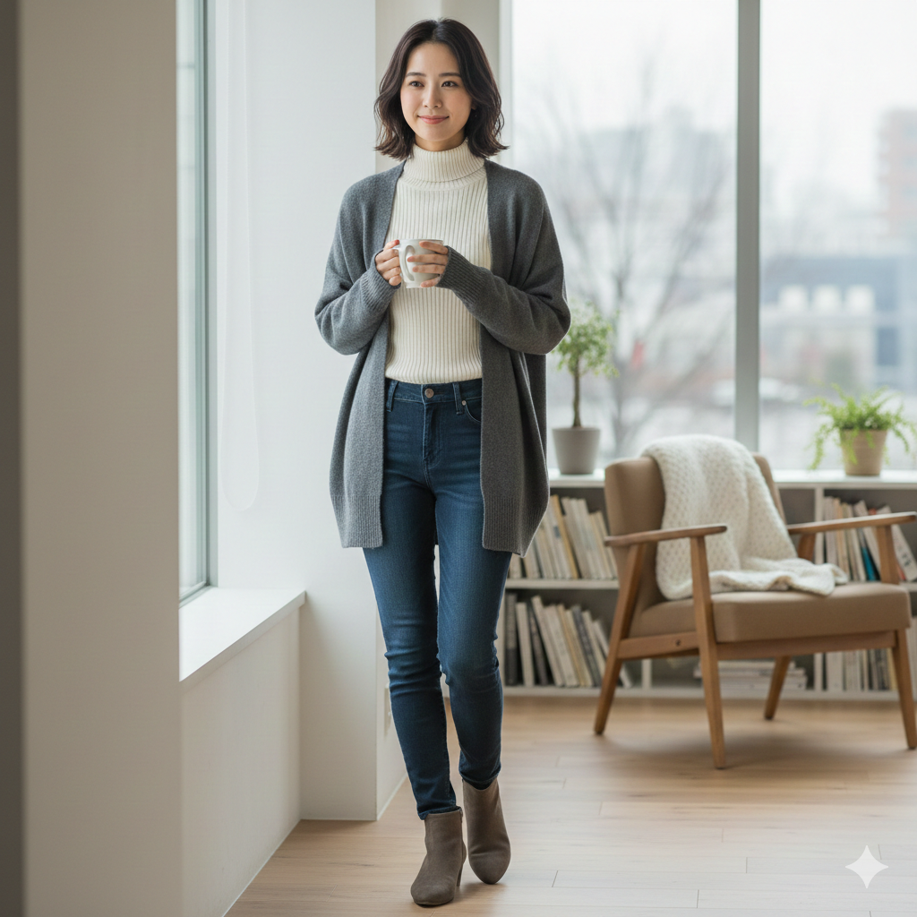 👖 カジュアルコーデ → デニムと合わせてすっきり見せ